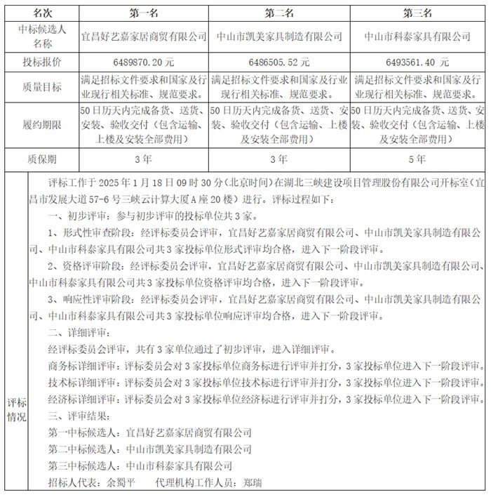 标段(包)编号:SXJS-CGZB-2024-151 一、招标概况 地建青年安居项目家具家电招标项目于2025年1月18日09时30分在乐鱼官方端网站登录入口-乐鱼leyu(中国) 开标室(宜昌市发展大道57-6号三峡云计算大厦A座20楼)开标、评标,根据评标委员会提交的评标报告,现将中标候选人公示如下: 二、评标结果