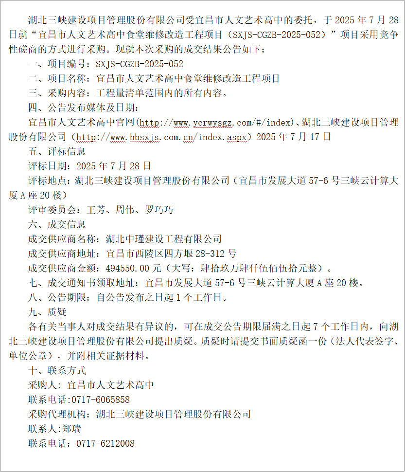宜昌市人文艺术高中食堂维修改造工程项目成交结果公告